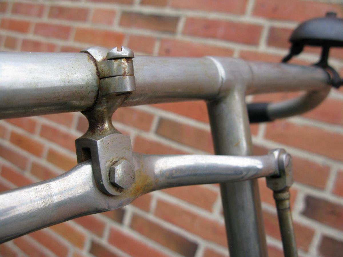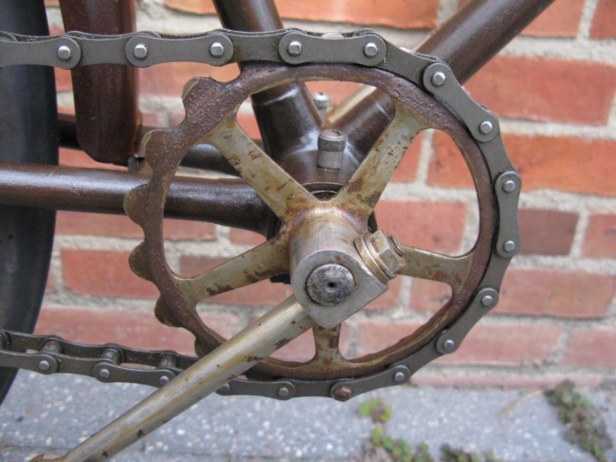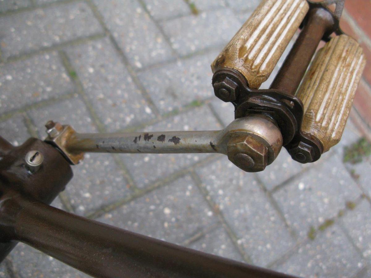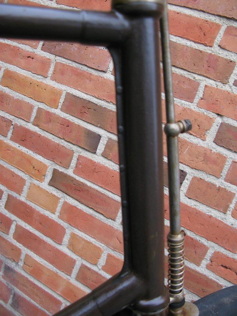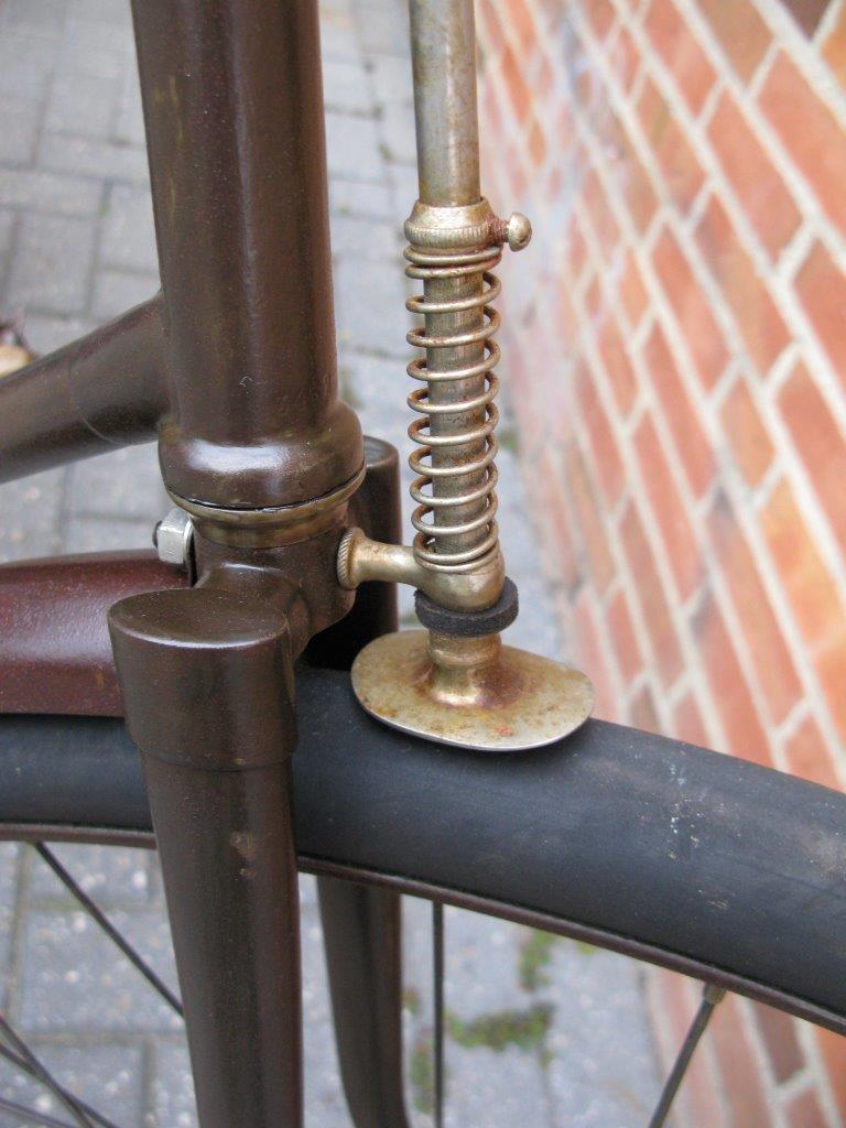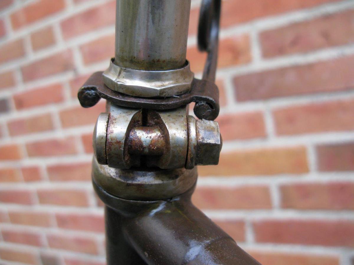 Very special and unique is the way the head tube is formed of pressed metal sheet, with a long vertical flange at the rear end. This tells us that Gladiator, a Paris-based firm that was taken over by Clément in 1896, was really an innovator.