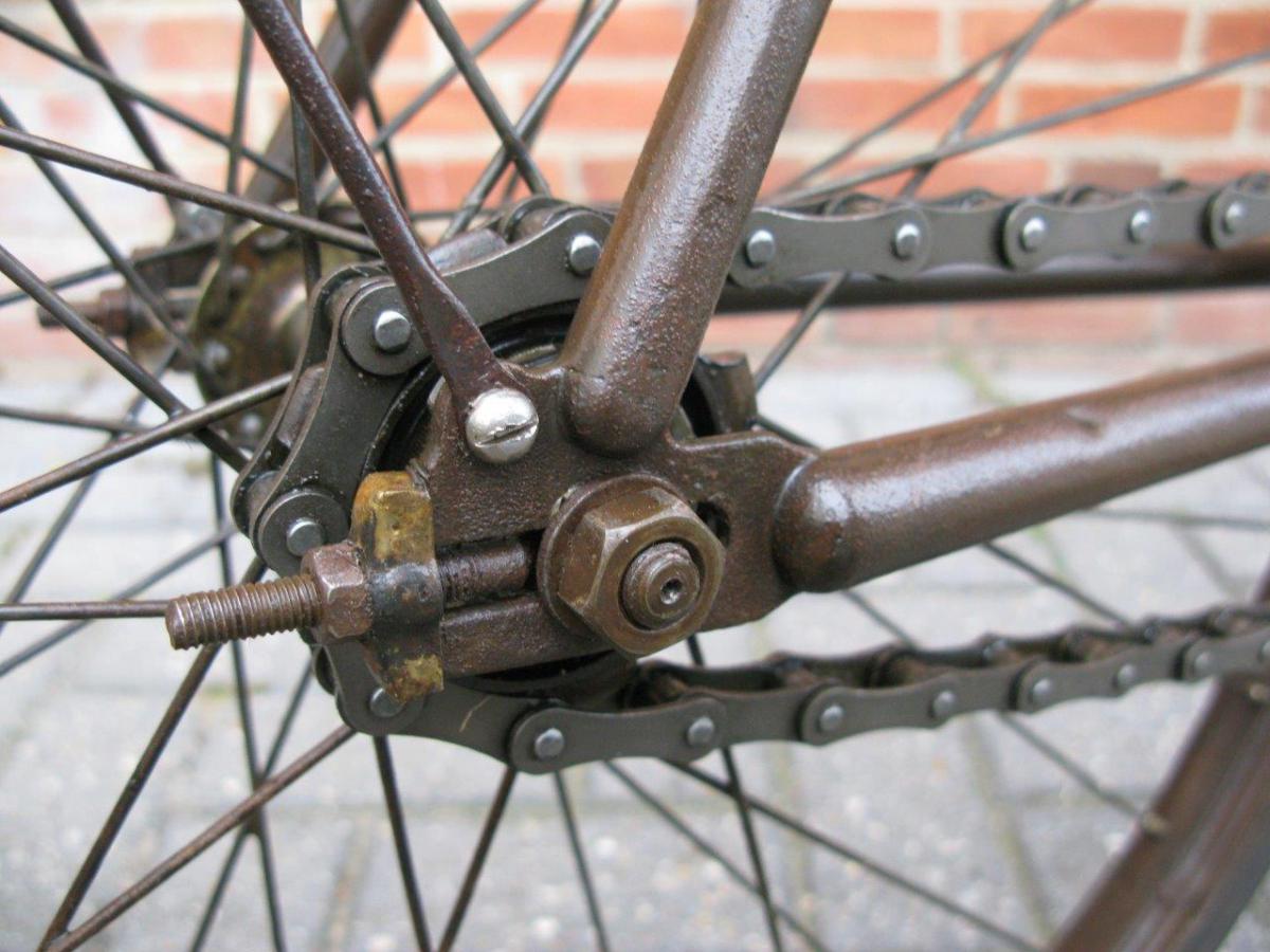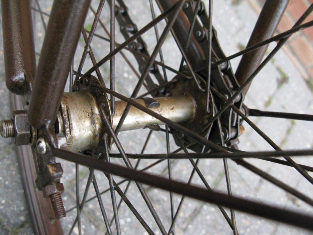 Most striking detail is of course the mount of the right crank to the bracket axle - a detail that is rarely seen, but not 100% exclusive for Gladiator. It seems that Brennabor also used this system. Left crank is attached with a normal cotter pin.